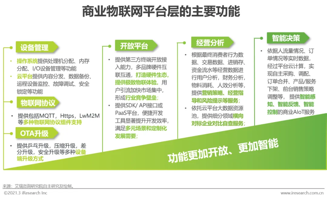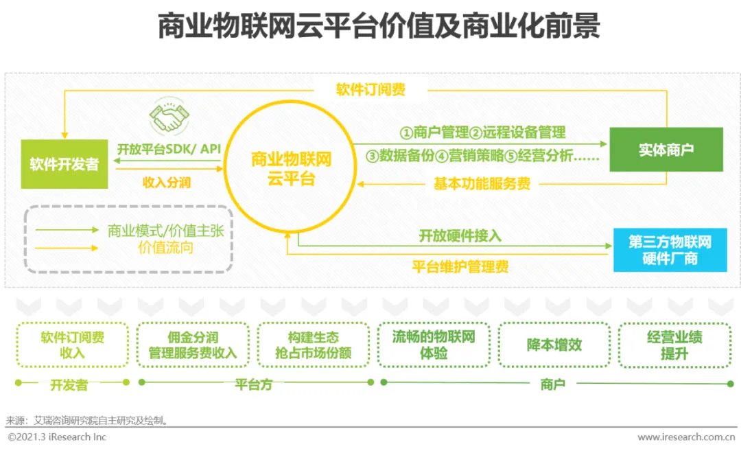 商业物联网平台层作为联通感知层和应用层的中枢神经,是实现产业多方 (开发者、服务商、商家)协作的关键,主要由商业物联网操作系统和云平台构成。在基础功能层面,商业物联网平台层提供全生命周期的移动设备管理服务(MDM)、物联网协议和OTA升级服务,随着云计算、边缘计算、PaaS平台等技术的应用发展和平台生态趋于开放,商业物联网平台层的职能和作用不断延展,开发者、商业用户和终端设备连接数量呈爆发式增长,平台网络效应凸显,面向软件开发者、商户的衍生增值服务应运而生,辅助商户以高效、低成本的方式制定经营管理策略。