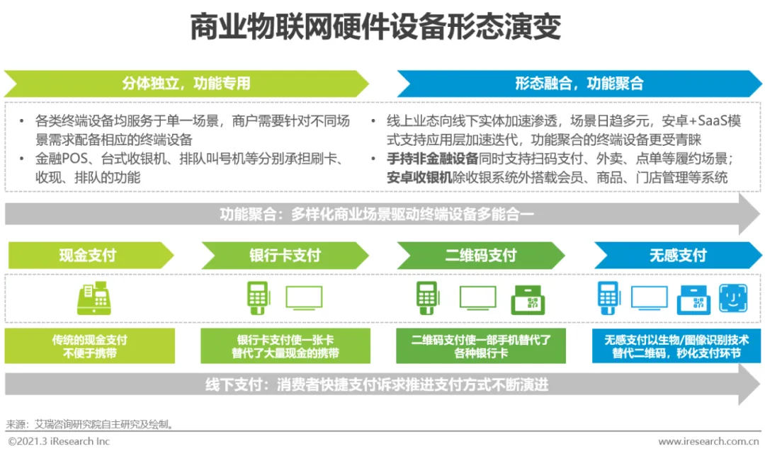 支付与信息技术的迭代,推动交易终端从最原始的现金收银到支付方式聚合的终端演变,相伴相生的是交易安全性与便捷性的大幅提升。商业场景的多样性也将驱使商业物联网终端设备的形态和功能走向融合与创新,单一功能的终端将趋于边缘化并被淘汰,强兼容、易操作、功能聚合的一体化终端是市场主流,搭配各类辅助外设配件,顾客在资金安全的前提下“轻而易举”的完成履约消费,提供消费者优质商业物联网感知体验的同时提升商业实体的运营效率。