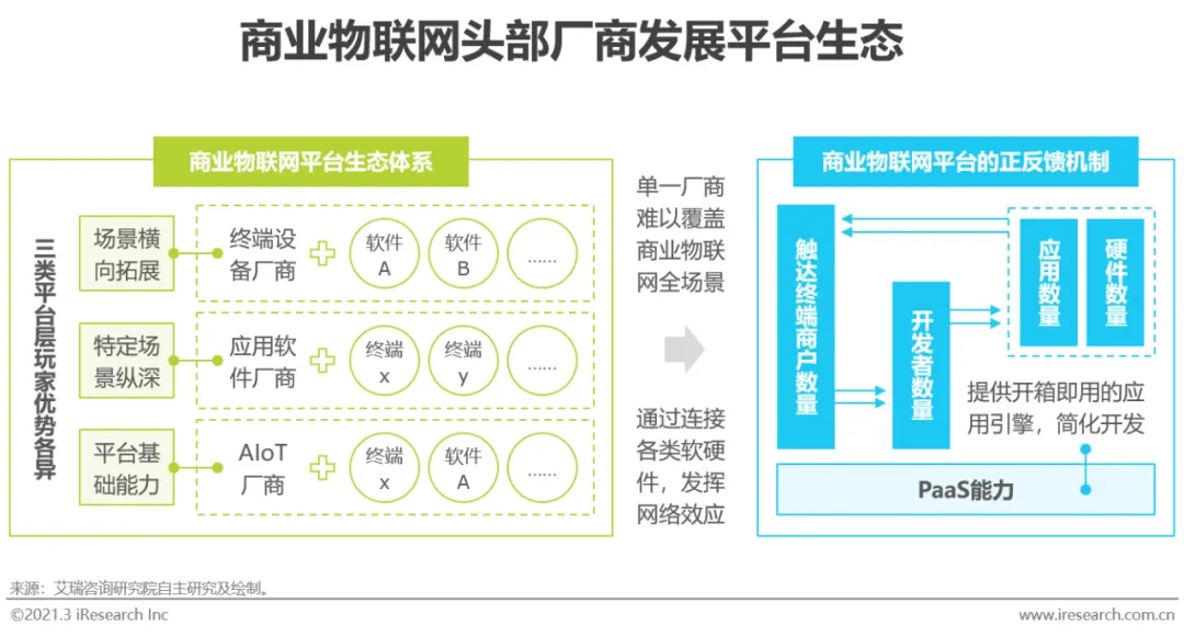 依托商业物联网平台的PaaS能力,开发者无需关注前期的环境搭建与后期的运维工作,因而有效降低了开发成本,大幅提升开发效率。终端商户触达量是网络效应的先决条件,一旦厂商在平台层占据流量入口,就会有越来越多的开发者入驻,共同完善商业物联网生态,形成正反馈机制,预计未来市场格局将进一步向头部集中。
