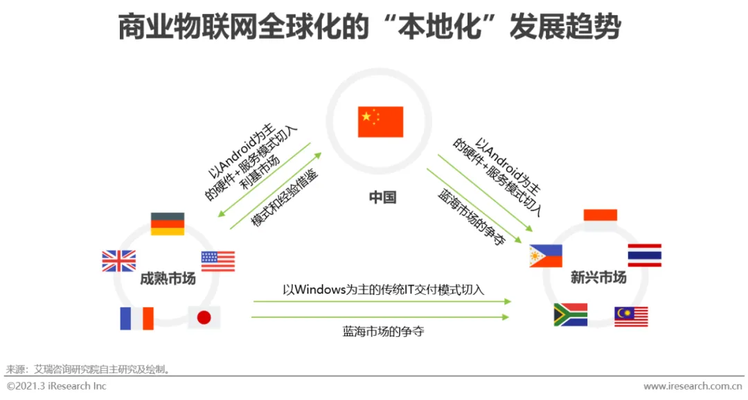 中国互联网和移动支付蓬勃发展,商业物联网的效能直接作用于近C端的实体门店并向产业链上游延伸,形成影响供应链及生产端的决策依据,使商业生态链高效运转,提高盈利能力。然而,商业物联网在全球各地区发展步调不一,商业物联网服务商不能照搬中国模式,应对海外市场时,需注意各国监管政策和移动支付发展进程的异同:发达国家的商业信息化程度高,因此对商业的数字化升级改造系重点,应侧重于与传统IT部署的结合;新兴发展中国家的商业信息化程度较低,市场开发潜力大,可能成为商业物联网服务提供商的市场争夺之地。