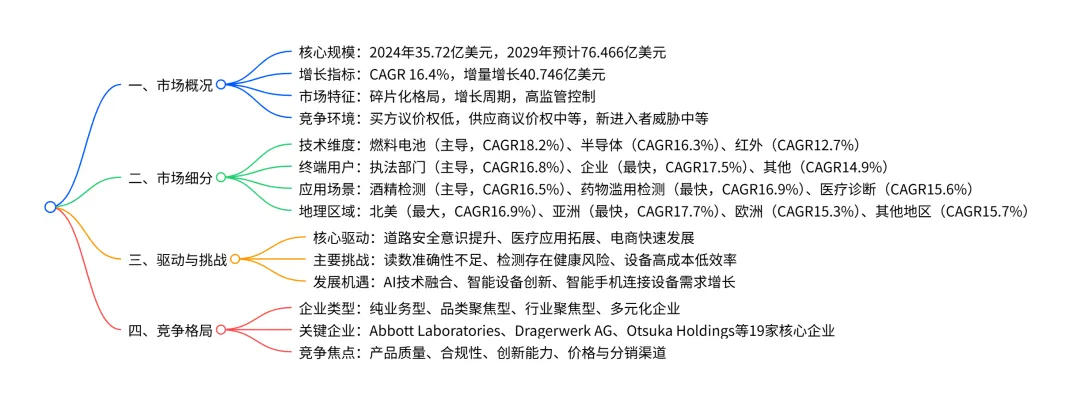 2024-2029年全球呼气分析仪市场呈现高速增长态势,2024年市场规模达 35.72亿美元,预计2029年将增至76.466亿美元,年复合增长率16.4%,增量增长 40.746 亿美元;市场呈碎片化竞争格局,北美为最大市场(2024年占比 28.7%),亚洲为增长最快区域(CAGR 17.7%);技术层面以燃料电池技术为主导(2024年占比43.3%,CAGR 18.2%),终端用户中执法部门占比最高(2024年48.5%),应用场景以酒精检测为核心(2024年54.7%);驱动因素包括道路安全意识提升、医疗应用拓展及电商发展,主要挑战为设备准确性不足、健康风险及高成本,AI 技术融合与智能设备创新成为主要发展机遇。