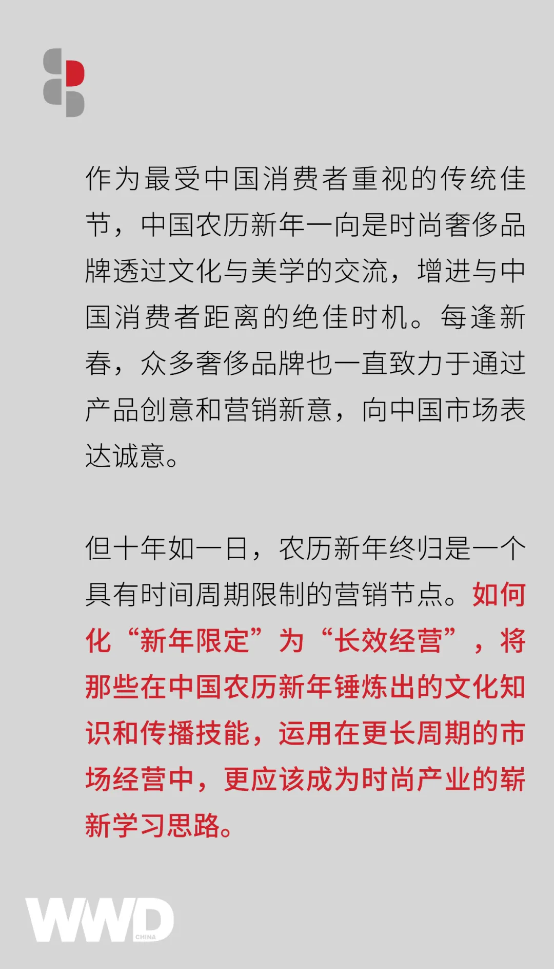自世纪之交,国际品牌大举进入中国市场起,一些“嗅觉灵敏”的先行者就开始围绕中国农历新年大作文章。彼时,东方色彩、传统纹样,曾一度是国际品牌面对这一传统佳节的核心策略。
