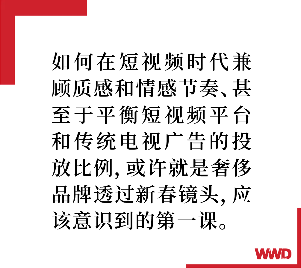 此外,在当今日益内卷化的世界,普遍的社会焦虑情绪催生出人们对“慢生活”的向往,而商业电视广告所指向的正是过往慢节奏的生活模式,或为时尚产业的内容营销带来新的空间与可能。如何在短视频时代兼顾质感及情感节奏,甚至于平衡短视频平台和传统电视广告的投放比例,或许就是奢侈品牌透过新春镜头,应该意识到的第一课。