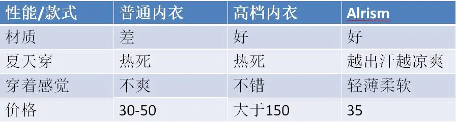 如果大家对比Alrism、普通内衣和高档内衣就会发现,Alrism的性价比是最高的。