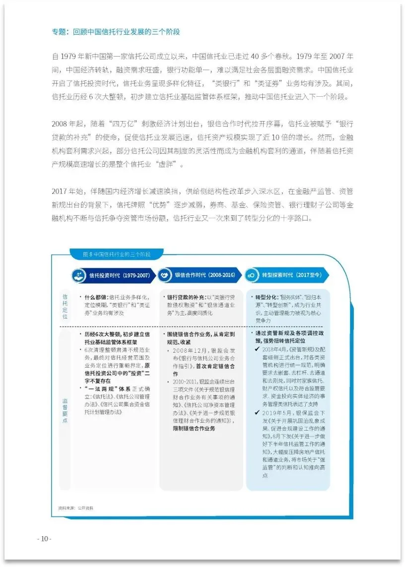 中国信托业已走过 40 个春秋,回顾过去,信托业发展几经波折,但通过不断创新,在丰富金融市场、弥补银行信用不足等方面发挥了积极作用。特别是在过去十年间,信托业发展迅速,受托资产规模实现了近 10 倍的增长。伴随国内经济减速换挡,供给侧结构性改革步入深水区,在金融监管要求金融机构回归本源的背景下,信托牌照优势逐步减弱,各类金融机构不断与信托争夺资管市场份额,信托行业已经来到转型分化的十字路口。