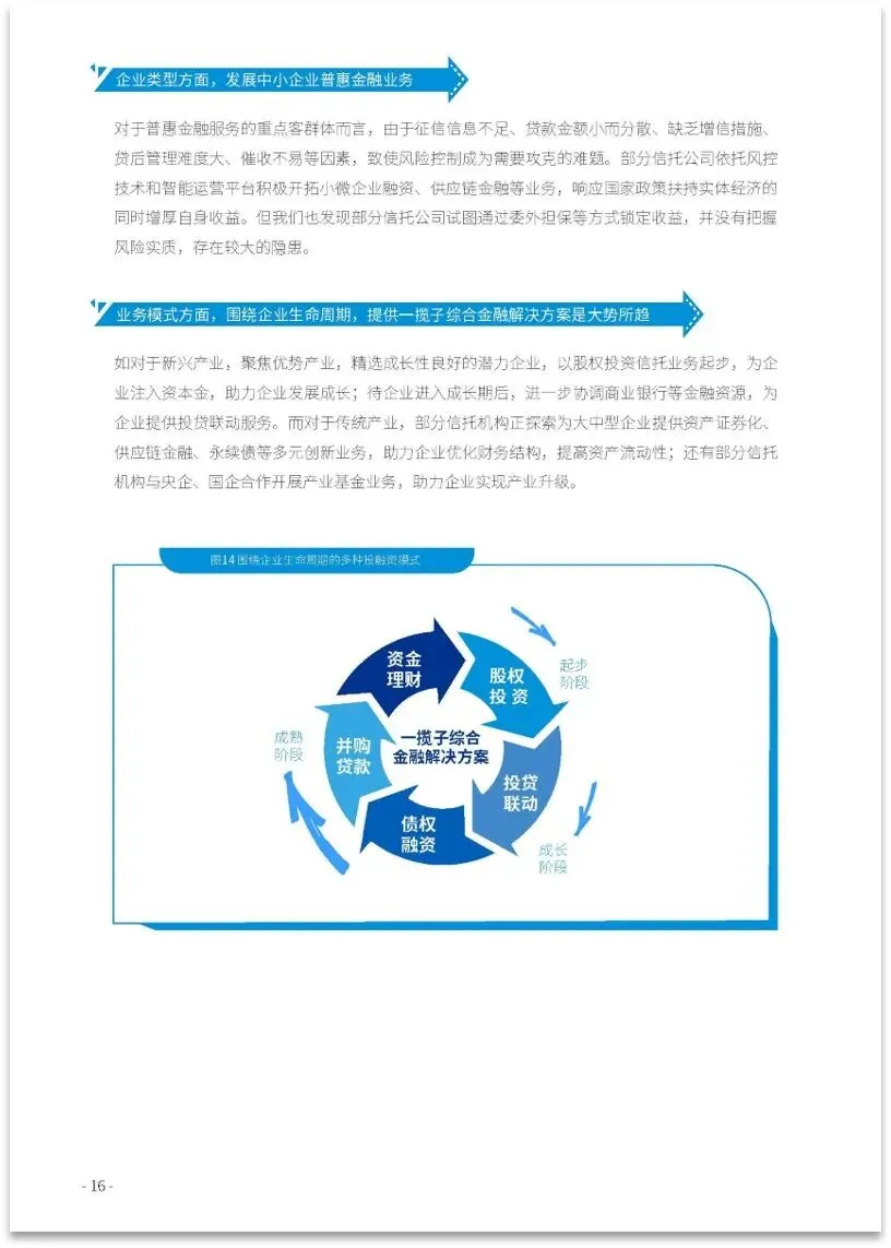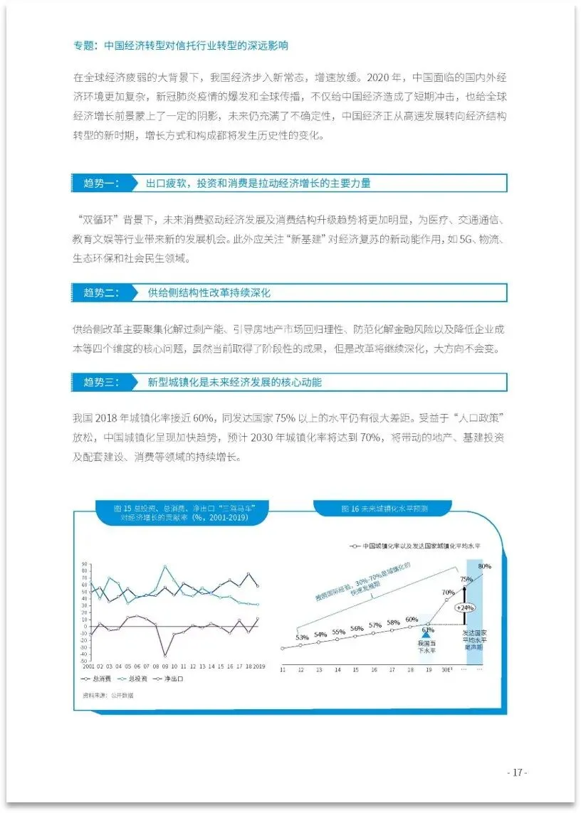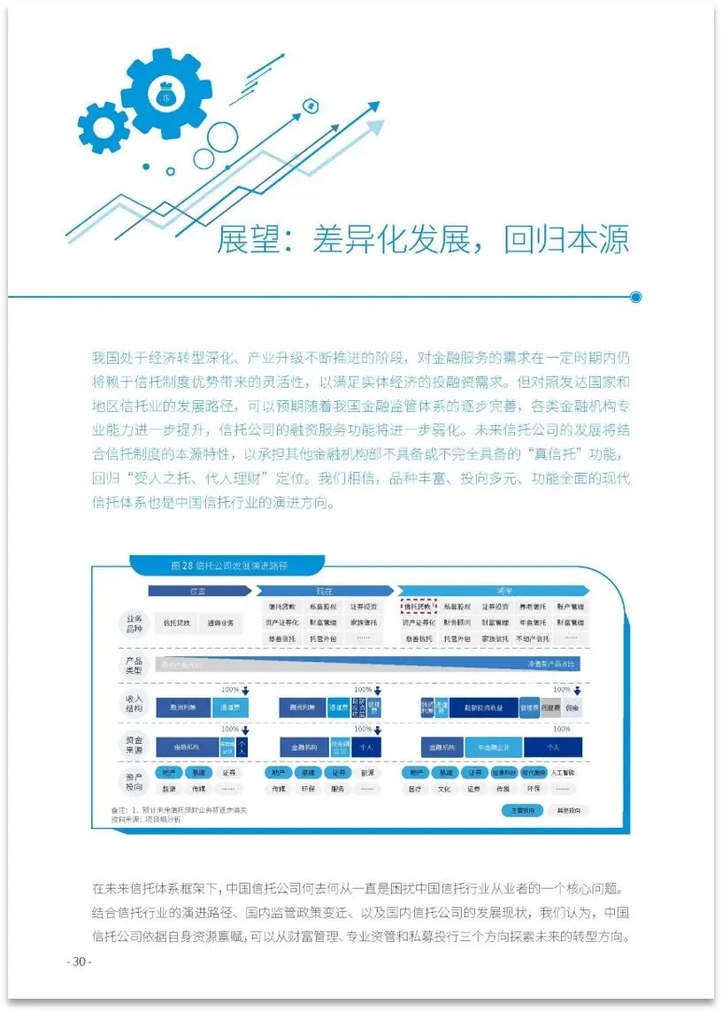 展望未来,我国处于经济转型深化、产业升级不断推进的重要战略机遇期,我国信托业必将继续发挥信托制度优势、灵活服务实体经济,于未来一段时间内在构建双循环新发展格局中有所作为。对照发达国家地区信托业的发展路径,可以预期随着我国金融监管体系的逐步完善,各类金融机构专业能力进一步提升,信托公司的融资服务功能将进一步弱化。未来信托公司的发展将结合信托制度的本源特性,以承担其他金融机构部不具备或不完全具备的“真信托”功能,回归“受人之托、代人理财”定位。我们相信,功能全面、服务专业、品种丰富、投向多元的现代信托体系也是中国信托行业的演进方向。