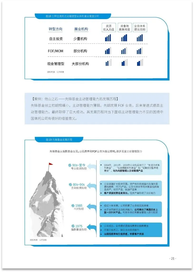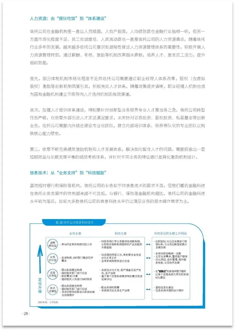 本报告在回顾我国信托业发展历程与分析国外信托类机构演进基础上,基于详实的数据分析和深入的市场调研,探讨了信托业面对机遇与挑战转型发展的路径——即依托自身资源禀赋,以私人财富管理机构、私募投行与专业资管机构三大方向为发力点,不断进行传统业务升级、新业务拓展和支撑体系优化建设。