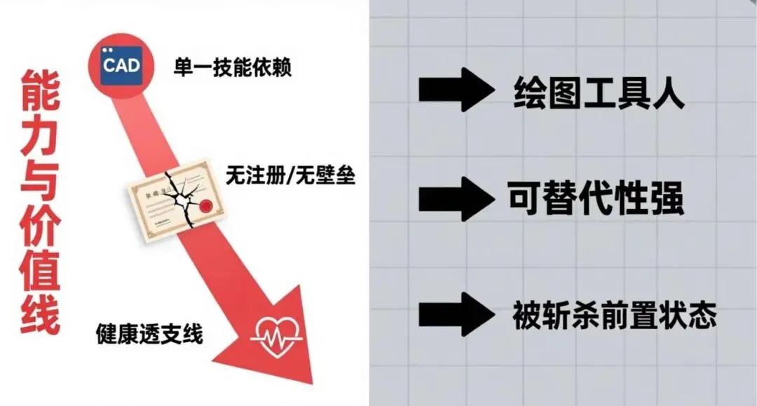 •单一技能依赖:只会CAD / 画图,无方案、无沟通、无管理、无数字化能力,沦为 “绘图工具人”。