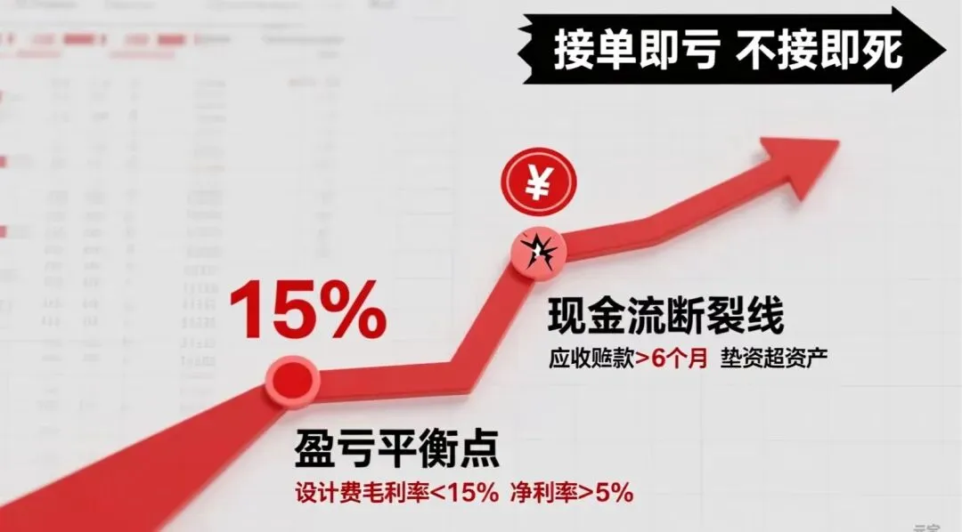 •盈亏平衡点:设计费毛利率 < 15%、净利率 <5%,接单即亏,不接即死。(PS:理论上不存在,设计院毛利率高达70%)