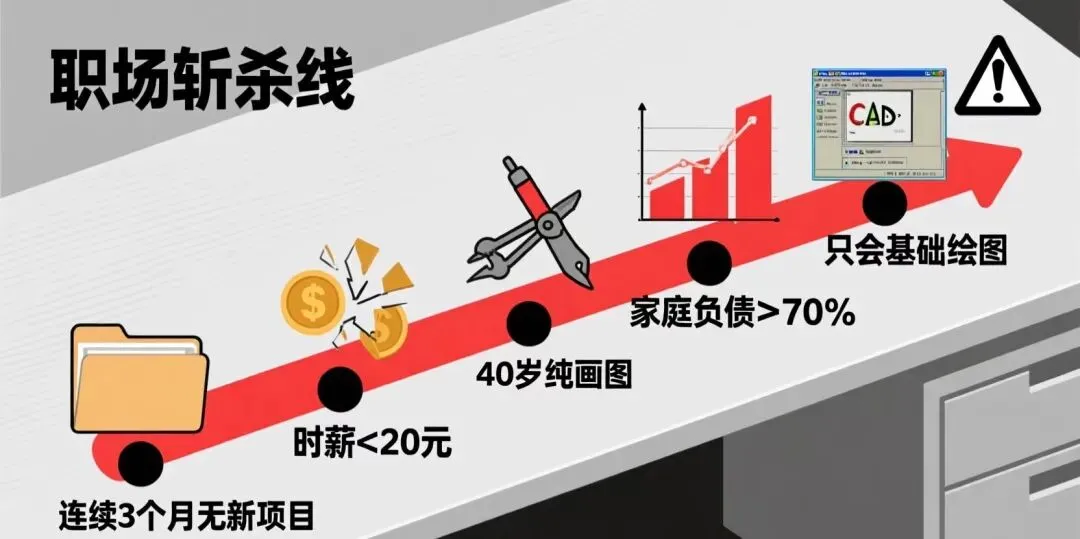 •40岁红线:40岁仍停留在纯绘图/执行层、未晋升管理或成为技术专家,且体力/精力跟不上高强度加班,极易成为裁员优先对象。