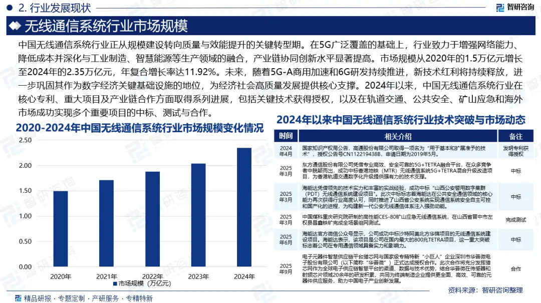无线通信系统是指利用无线电波等无线信号进行信息传输的通信系统。它不需要通过有线电缆进行信息传输,可以实现移动通信、远程控制、传感器网络等多种功能。无线通信系统广泛应用于手机通讯、电视广播、卫星导航、智能家居、工业自动化等领域,成为现代通信和科技发展的重要组成部分。无线通信系统主要包括发射端、传输介质和接收端。中国无线通信系统行业近年来持续受到5G技术规模化部署、工业互联网加速渗透以及物联网应用场景不断拓展的驱动,整体发展呈现出技术创新与需求扩张双轮并进的格局。在基础设施建设方面,截至2025年10月末,全国累计建成5G基站总数达到475.8万个,比2024年末净增50.7万个,占移动基站总数的37%,占比前三季度提高0.4个百分点。5G网络已实现地级以上城市全覆盖,并逐步向县乡区域纵深延伸。从用户渗透率来看,截至2025年10月末,我国5G移动电话总数突破11.84亿户,较2024年末净增1.7亿户,占移动电话用户的64.7%,显示出消费者端对高速无线通信服务的强劲需求。在终端设备层面,2025年前三季度,国内5G手机累计出货量为1.87亿部,同比增长0.1%,占同期手机出货量的85.3%,表明5G已经成为智能手机标配技术。随着RedCap技术标准的成熟,面向智能穿戴、工业传感器等中低端场景的轻量化5G模组开始批量商用,进一步拓宽了无线通信系统的应用边界。在技术演进与前沿探索方面,行业正稳步迈向5G-Advanced(5G-A)阶段。2024年以来,国内主要电信运营商已在多个重点城市启动5G-A关键技术的验证和试商用部署。中国移动在北京、上海、杭州等城市部署了5G-A万兆下行示范网络,实测峰值下行速率已突破10Gbps;其通感一体化技术在低空经济领域取得重要进展,应用于无人机监控与飞行管理的试验网络覆盖范围已达数百平方公里。中国电信和中国联通品牌运营商共建共享5G-A基站约7万站,有效带动了芯片、模组、终端等产业链上下游企业的协同集聚与创新发展。中国无线通信系统行业正从规模建设转向质量与效能提升的关键转型期。在5G广泛覆盖的基础上,行业致力于增强网络能力、降低成本并深化与工业制造、智慧能源等生产领域的融合,产业链协同创新水平显著提高。市场规模从2020年的1.5万亿元增长至2024年的2.35万亿元,年复合增长率达11.92%。未来,随着5G-A商用加速和6G研发持续推进,新技术红利将持续释放,进一步巩固其作为数字经济关键基础设施的地位,为经济社会高质量发展提供核心支撑。2024年以来,中国无线通信系统行业在核心专利、重大项目及产业链合作方面取得系列进展,包括关键技术获得授权,以及在轨道交通、公共安全、矿山应急和海外市场成功实现多个重要项目的中标、测试与合作。例如,2024年4月,国家知识产权局公告,高通股份有限公司取得一项名为“用于基本和扩展准予的技术”,授权公告号CN112219438B,申请日期为2019年5月。2025年6月,海能达官方微信公众号显示,公司成功中标沙特阿美北方华锦项目的无线通信系统建设项目。海能达表示,该项目是公司在国内最大的800兆TETRA项目,这一重大突破标志着公司在专用通信领域具备实力和影响力。当前,中国无线通信系统行业已形成运营商主导、设备商与专业化厂商协同发展的多层次竞争格局。以中国移动、中国电信、中国联通为代表的综合电信运营商,凭借其网络覆盖、用户规模及服务整合能力,在行业生态中居于核心地位。与此同时,一批如大富科技、武汉凡谷、三维通信等在射频器件、天线、网络优化等细分领域具备技术专长的设备与解决方案提供商,正通过持续的技术创新与国产化替代,在产业链关键环节中不断巩固和提升市场份额。整体格局呈现出由规模化运营、专业化创新与产业链自主化共同驱动的动态平衡态势。