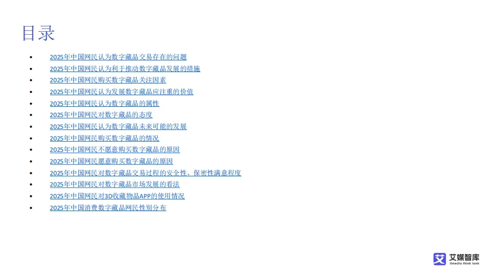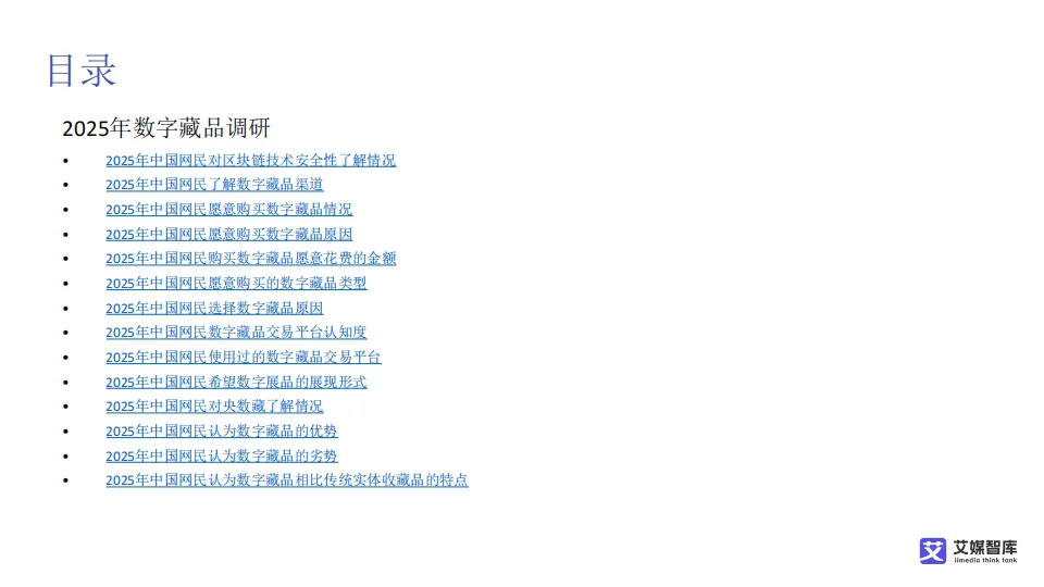 这份艾媒咨询2022-2025年中国数字藏品市场消费行为调查数据,围绕网民对数字藏品的认知、消费行为、市场看法等维度展开多维度调研,还针对白领、Z世代、大学生等群体做了专项分析,清晰呈现了国内数字藏品市场的发展特征与用户偏好变化。