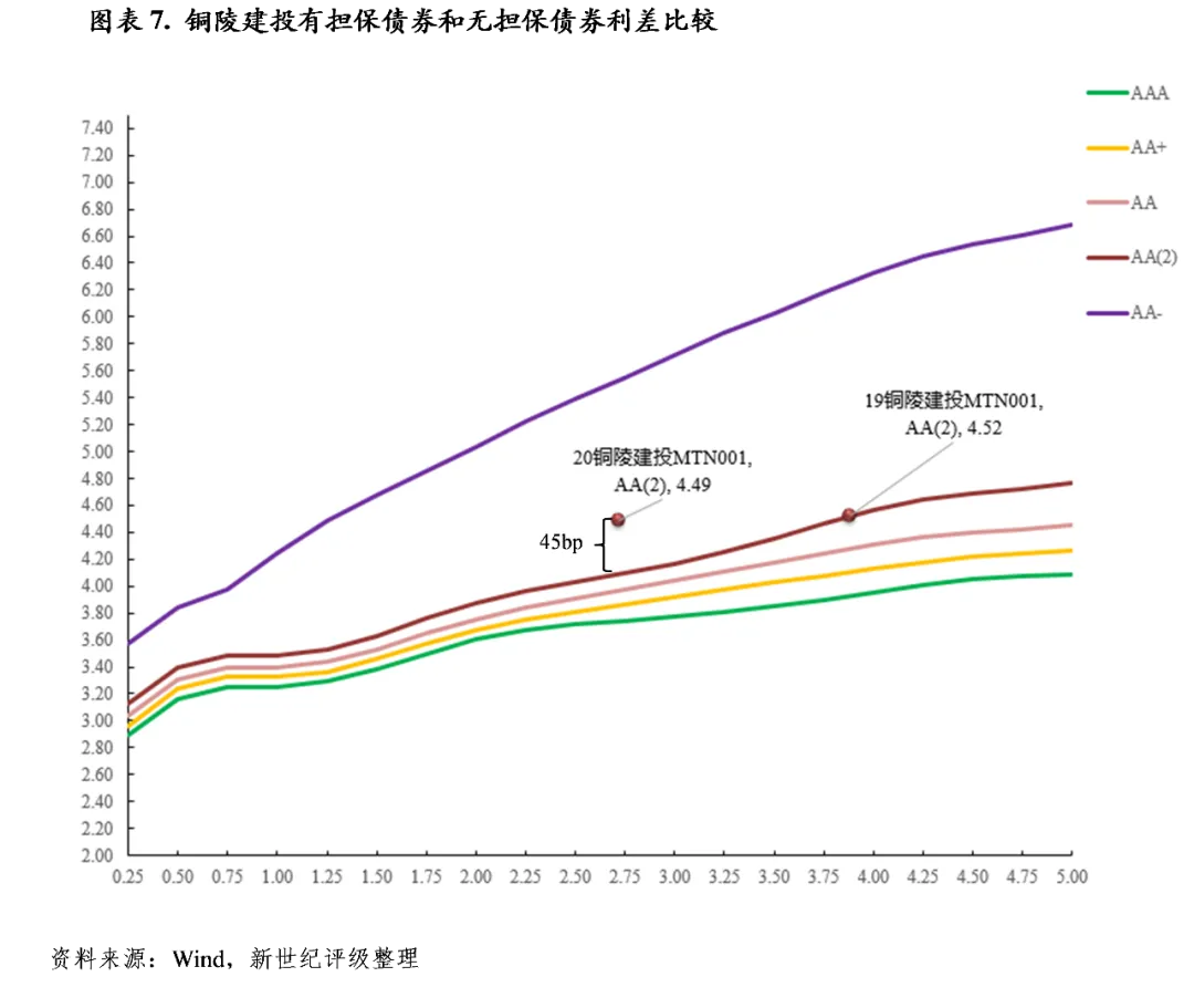 以铜陵建投发行的两期债券为例,“19铜陵建投MTN001”由安徽担保集团提供担保,其中债收益率为AA(2)曲线上浮0bp,“20铜陵建设MTN001”为无担保债券,其中债收益率为AA(2)曲线上浮45bp,则担保利差为45bp。