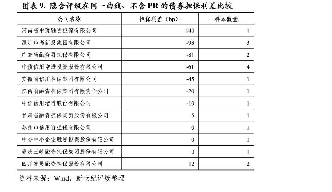 从隐含利差压缩的角度看,河南中豫担保、深圳高新投、广东再担保、中债增等对不含提前偿付(简称“PR”)条款的样本债券压缩了更多隐含利差;河南中豫担保、中投保、重庆进出口担保、武信管理、江苏再担保等对含有PR条款的样本债券压缩了更多隐含利差。