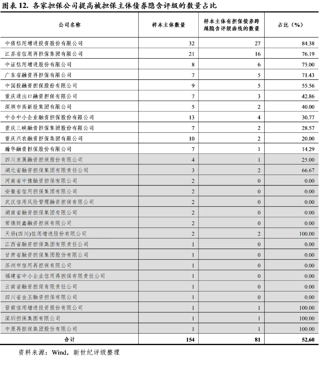 从隐含评级提升的角度看,中债增、江苏再担保、中证增、广东再担保、中投保的担保效力相对更强,上述担保公司所担保债券较之同一发行人所发无担保债券,有超过半数的隐含评级得到了提升。