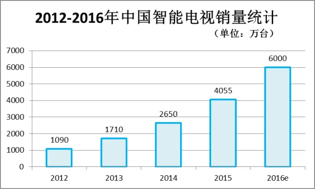 2012年国内智能电视的销量仅1090万台,随着智能电视软硬件技术的逐渐成熟和普及,智能电视的生产门槛降低,中低端智能电视价格也逐渐被大众所接受,如今智能电视已经几乎成为了电视的“标配”。2015年国内智能电视的销量达到4055万台,预计2016年将超过6000万台。