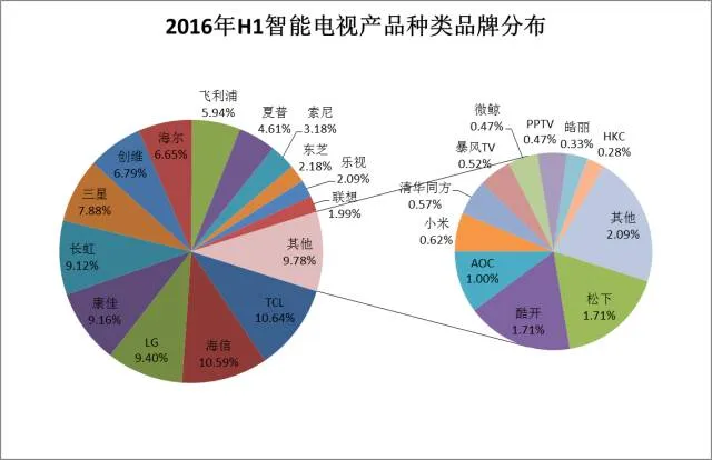纵观中国智能电视市场的品牌,可谓百花齐放。其中以TCL、海信、LG、康佳、长虹、三星、创维、海尔等传统电视厂商作为主导。后入局的像乐视、小米、PPTV、暴风TV、微鲸等互联网品牌也凭借内容在智能电视市场分得一杯羹。而像PC企业如联想、清华同方,以及显示器品牌AOC、HKC等也在智能电视市场有所动作。而且除此之外,由于技术,门槛降低,一些代工企业也开启了智能电视的生产之路。