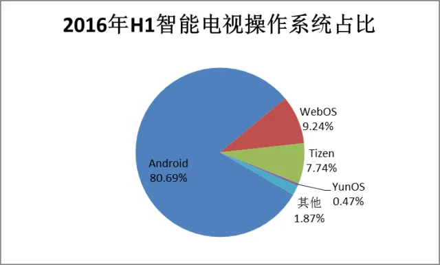 智能电视的操作系统方面,Android依然以其高兼容性、软件内容丰富等优势占据了智能电视操作系统的大部分份额,占比为80.69%,但较2015年占比82%有所下降。WebOS、Tizen都是基于Linux开发的可以搭载到智能电视上的智能操作系统,其中WebOS占比9.24%,Tizen占比7.74%。WebOS是HP时代消费电子市场失败后,被LG全部收购,并搭载到了最新的产品中。而Tizen则是两大Linux联盟联手英特尔和三星电子,共同开发的针对手机和其他设备的操作系统,目前已经搭载到三星部分智能电视终端上。而YunOS是阿里巴巴研发的操作系统,在微鲸等智能电视上有搭载。