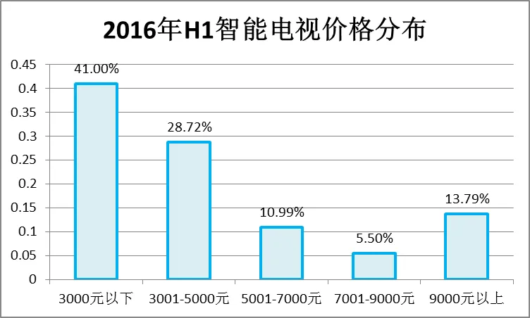 智能电视的价格在3000元以下占比最高,占到了41%,较2015年的占比提升了5%,3001-5000元价位占比28.72%,占比有所下降。9000元以上的高端产品占比为13.79%,较2015年变化不大。