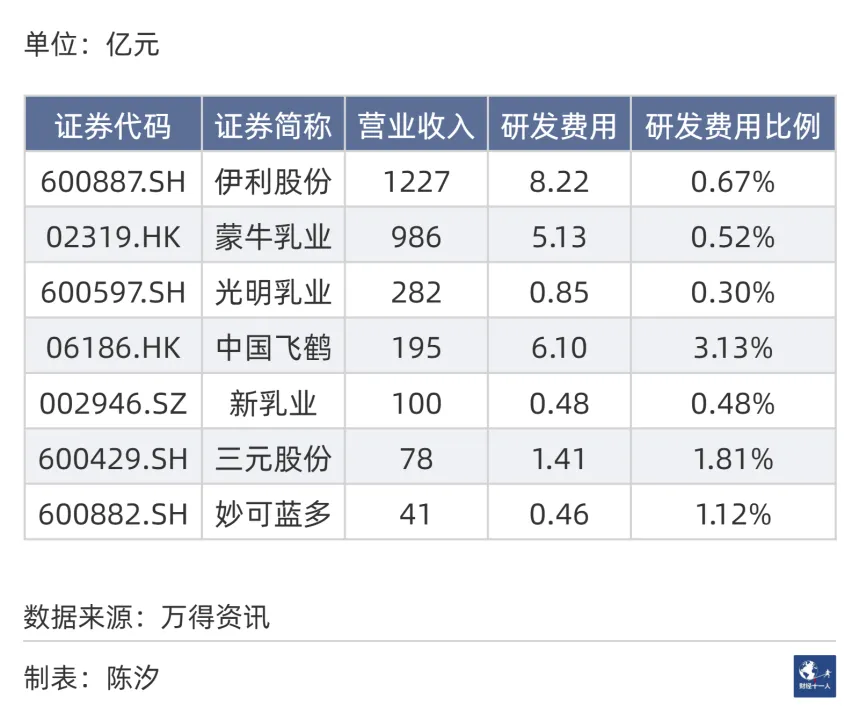 我们又比较了主流乳制品企业的研发费用占比。表1显示,中国飞鹤排名第一,排名第二的是三元股份。