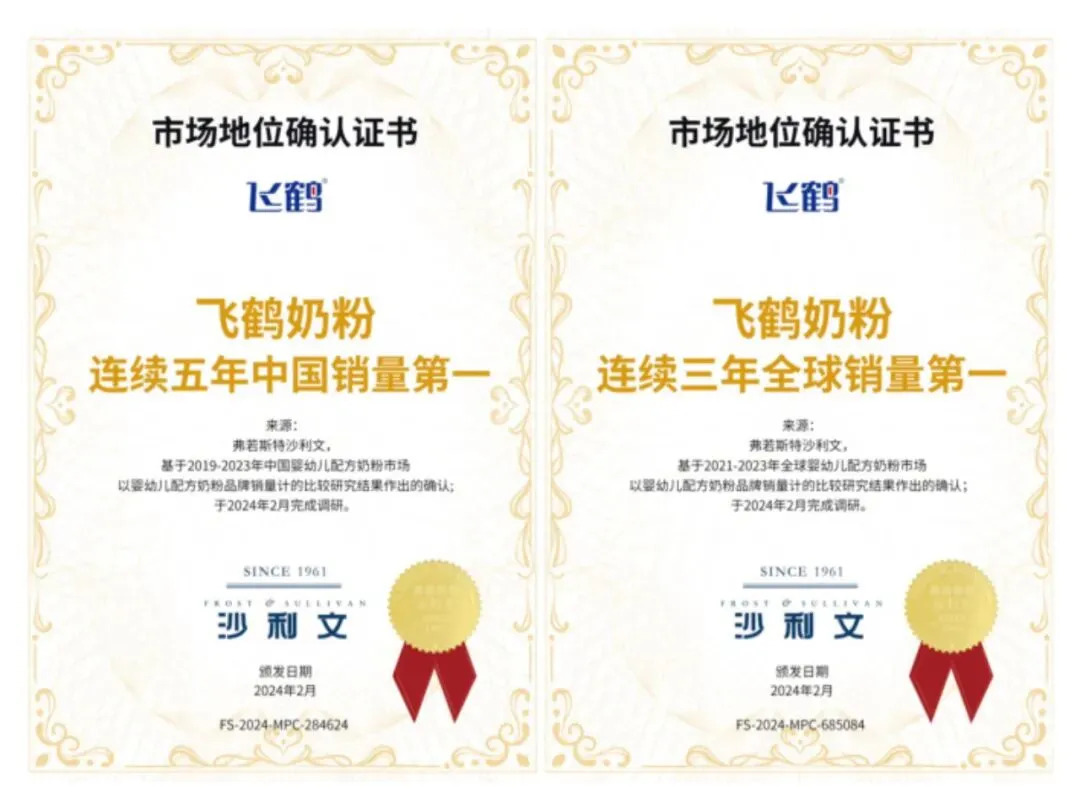 根据沙利文全新数据,飞鹤奶粉在2019-2023年连续5年奶粉第一,连续3年全球销量第一。旗下星飞帆系列成为婴儿奶粉品类全球第一大单品。