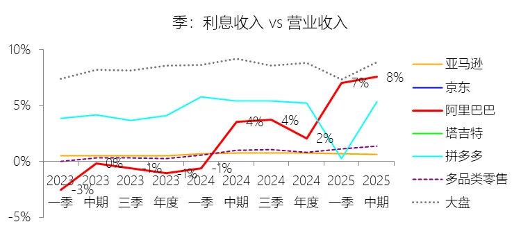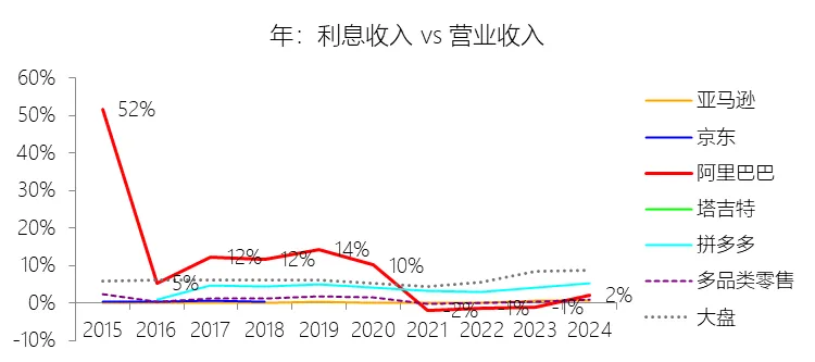利息收入:2026财年中期,阿里巴巴的利息收入为52.73亿美元,同比增长115.72%,与营业收入的比例为7.56%,同比上升3.99个百分点;2016-2025财年(十年),此项合计为395.05亿美元,平均比例为4.66%,比多品类零售行业的均值高3.91个百分点,长期呈下降趋势。比例短期上升主要由于公司在2026财年中期虽然营业收入增速放缓(仅增长1.85%),但通过优化财务管理,其持有的庞大现金、定期存款及限制性现金等利息收入资产规模依然处于高位,在外部利息环境波动及公司增加高收益理财/国债等库务投资布局的背景下,利息收入实现了115.72%的爆发式增长;同时,如前所述,由于公司剥离了部分高营收低利润的实体零售业务,营业收入(分母)的扩张受限,导致利息收入在总收入中的占比出现结构性激增。比例长期下降主要由于阿里巴巴的业务模式发生了重大转型,从早期极高毛利的“资产轻型”平台模式逐渐向包含天猫超市、盒马及合并高鑫零售等在内的“新零售”直营模式靠拢,这使得总营收(分母)在过去十年间实现了跨越式增长,其增速远超利息资产的自然增值速度;此外,公司近年来大幅提升了股东回报力度,通过大规模股份回购和派发股息消耗了大量账面现金,从而相对削弱了利息收入资产的增长基数。比例高于多品类零售行业的均值主要由于阿里巴巴核心的电商平台业务(淘宝和天猫)本质上是高度数字化的流量货币化模型,具有极强的现金流产生能力且无需承担传统零售业沉重的存货和大量线下门店等资本开支,从而形成了巨大的“现金池”;公司长期维持的这种战略性现金储备(截至2025财年达5971.32亿人民币)远超传统零售商的平均水平,使其能够凭借规模效应获得远高于行业均值的存款利息和投资回报。