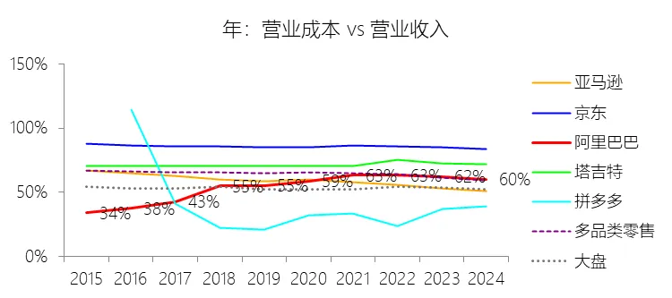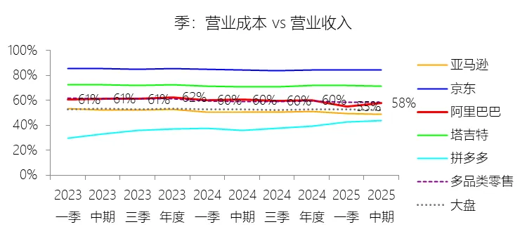 营业成本:2026财年中期,阿里巴巴的营业成本为404.21亿美元,同比减少2.37%,与营业收入的比例为57.97%(营业成本率,即1-毛利率),同比下降2.51个百分点;2016-2025财年(十年),此项合计为4966.02亿美元,平均比例为58.58%,比多品类零售行业的均值低5.17个百分点,长期呈上升趋势。