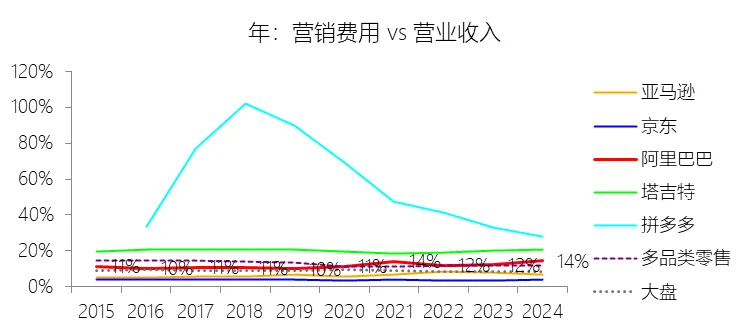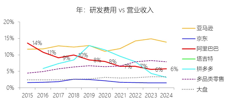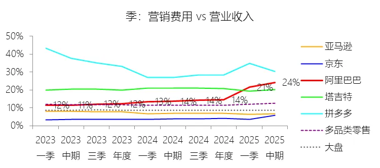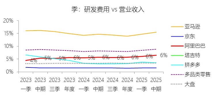 营销费用:2026财年中期,阿里巴巴的营销费用为168.42亿美元,同比增长81.11%,与营业收入的比例为24.15%,同比上升10.57个百分点;2016-2025财年(十年),此项合计为1041.46亿美元,平均比例为12.29%,比多品类零售行业的均值低0.06个百分点,长期呈上升趋势。