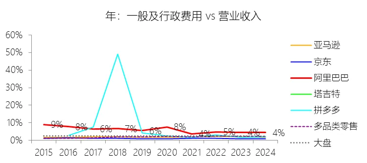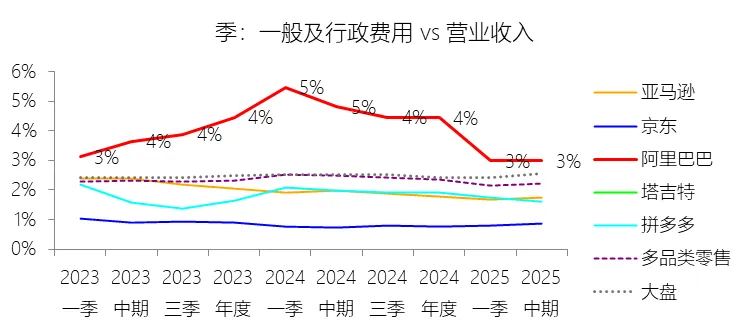 一般及行政费用:2026财年中期,阿里巴巴的一般及行政费用为20.80亿美元,同比减少36.79%,与营业收入的比例为2.98%,同比下降1.82个百分点;2016-2025财年(十年),此项合计为451.09亿美元,平均比例为5.32%,比多品类零售行业的均值高3.22个百分点,长期呈下降趋势。