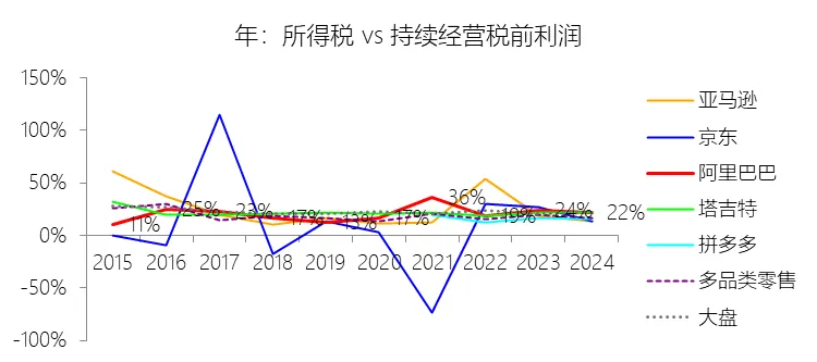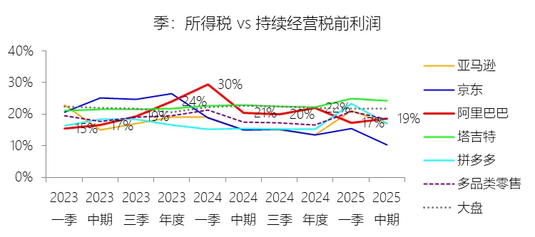 所得税率:2026财年中期,阿里巴巴的所得税为20.29亿美元,同比减少18.5%,与持续经营税前利润的比例为18.62%(所得税率),同比下降1.9个百分点;2016-2025财年(十年),此项合计为306.14亿美元,平均比例为19.69%,比多品类零售行业的均值高1.59个百分点,长期呈上升趋势。