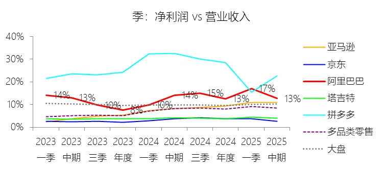 净利率:2026财年中期,阿里巴巴的净利润为88.66亿美元,同比减少8.06%,与营业收入的比例为12.71%(净利率),同比下降1.37个百分点;2016-2025财年(十年),此项合计为1248.67亿美元,平均比例为14.73%,比多品类零售行业的均值高9.49个百分点,长期呈下降趋势。比例短期下降主要由于阿里巴巴在近期加大了对用户体验、价格竞争力和即时零售业务(如“淘宝秒送”及饿了么)的战略性投入,导致销售与营销费用在收入中的占比显著上升,对中期利润表现产生了直接压力。同时,公司持续推进“AI驱动”战略,增加了在云基础设施和人工智能技术研发方面的投入,加之部分直营业务在剥离或调整过程中的成本波动,共同收窄了短期的利润空间。比例长期下降主要由于业务结构的重大转型,公司由早期高毛利的平台撮合模式(淘宝、天猫的广告与佣金)逐渐转向直营业务占比更高的“新零售”模式(如天猫超市、盒马、高鑫零售),此类业务营收虽高但涉及大量库存和物流成本,显著拉低了合并报表的净利率。此外,中国互联网行业竞争持续加剧导致获客及留存成本攀升,且公司长期对本地生活、国际扩张及数字媒体等处于亏损或投入期的业务进行持续注资,加上宏观经济环境变化及监管因素带来的非经营性减值(如商誉减值和反垄断罚款),使得长期盈利比例呈现下行趋势。比例高于多品类零售行业的均值主要由于阿里巴巴的核心电商业务(淘宝和天猫)本质上是轻资产的数字平台模式,凭借强大的网络效应和极高的经营杠杆,在不需要持有大量存货或固定资产的情况下即可实现海量交易,其流量获取与转化效率远超传统零售商。此外,公司通过高度数字化的营销服务模型(如P4P和信息流推广)构建了极具竞争力的货币化体系,能够通过大数据优化商家roi并获得高利润回报;同时,公司前瞻性布局的云计算业务在释放规模效应后,也逐步贡献了优于传统零售行业的科技溢价,支撑了整体利润率维持在行业领先水平。