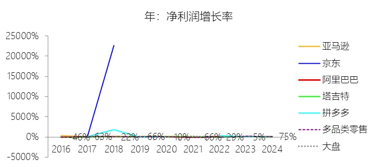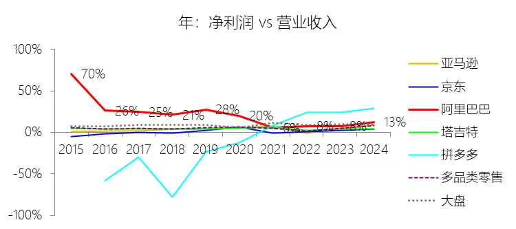营业收入增长率:2026财年中期,阿里巴巴的营业收入为697.27亿美元,同比增长1.85%,增速同比下降5.25个百分点;2016-2025财年(九年)增长786.69%,年复合增长27.44%,比多品类零售行业的复合增速高11.5个百分点,长期呈下降趋势。增速短期下降主要由于公司执行了业务剥离战略,完成了对高营收但利润贡献较低的实体零售业务(如高鑫零售和银泰商业)的处置,导致合并报表的营收基数相应收缩,若剔除这些非经营性因素,其可比口径下的营收增速实际上更为稳健;同时,近期国内宏观经济环境面临挑战导致消费需求疲软,加之电商行业竞争持续加剧,公司为了提升用户体验和支持商家发展,加大了在价格竞争力和用户补贴方面的投入,这在短期内对客户管理收入(CMR)的增长产生了压力。增速长期下降主要由于随着阿里巴巴营收规模达到极高基数,在大数定律的作用下,维持早期的高百分比增长变得愈发困难,增长率随规模扩大自然趋缓;此外,中国互联网用户红利逐渐消退,活跃消费者规模增速放缓,且公司面临来自腾讯生态内电商、短视频社交电商等新兴势力的激烈流量竞争;长期来看,监管环境的变化、地缘政治紧张局势以及宏观经济从高速增长向高质量增长的转型,也对传统核心电商业务的长期扩张速度构成了结构性约束。增速高于多品类零售行业的复合增速主要由于阿里巴巴构建了独特的数字经济生态系统,通过淘宝和天猫形成了强大的网络效应,在用户粘性、产品丰富度及流量获取成本上具有传统零售难以企及的优势;公司成功抓住了零售业数字化转型机遇,并前瞻性地布局了云计算(阿里云)等具备长期高复合增长潜力的科技业务,这些“第二增长曲线”在多个财年实现了三位数或高速的增长,显著拉升了整体营收表现;此外,公司通过持续的战略性收购和全球化扩张(如整合Lazada、Trendyol、饿了么、考拉等),将业务版图从单一的国内电商拓展至跨境贸易、本地生活服务及数字媒体娱乐等多元化赛道,通过资产注入和生态协同实现了规模的跨越式增长。