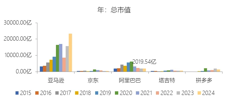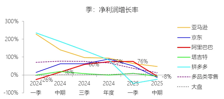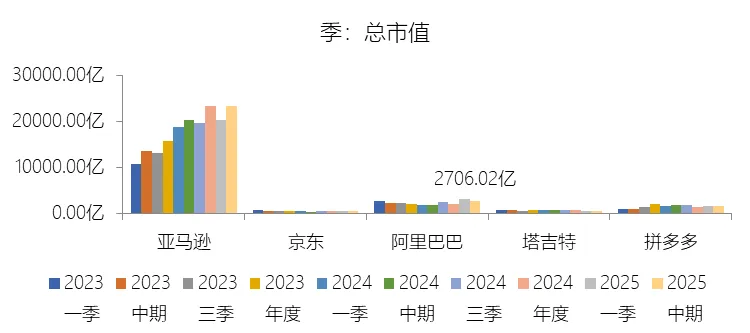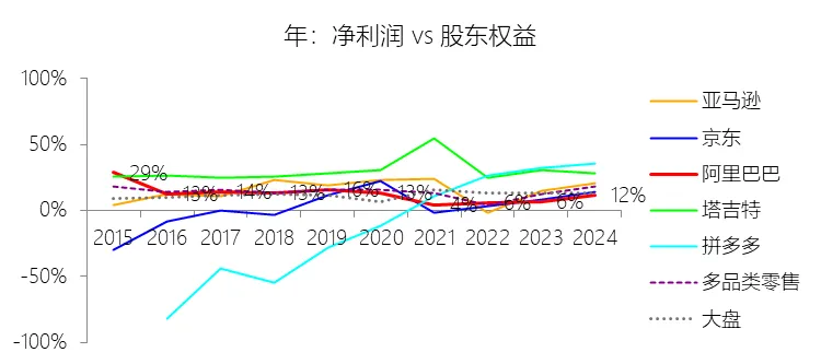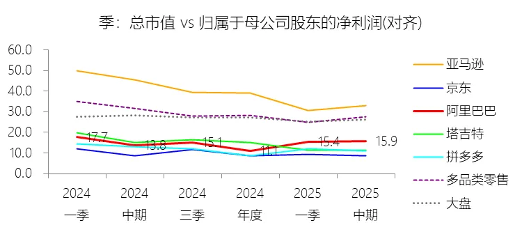 市值增长率:2026财年中期末,阿里巴巴的总市值为2706.02亿美元,对比年初增长33.99%,增速同比(去年同期)上升47.14个百分点;2016-2025财年(九年)增长0.3%,年复合增长0.03%,比多品类零售行业的复合增速低17.17个百分点,长期呈下降趋势。**增速短期上升主要由于**公司确立了“用户为先、AI驱动”的战略清晰度,阿里云AI相关业务连续多个季度实现三位数爆发式增长,显著提升了投资者对公司科技溢价的未来预期。同时,公司在资本管理方面表现积极,2025财年通过大规模注销式回购减少了5.1%的流通股,并派发了可观的股息,这种强力的股东回馈策略直接驱动了股价及市值的回升。此外,受益于中期内权益性投资资产的公允价值回升,公司账面净利润表现优于市场预期,进一步提振了二级市场的投资信心。**增速长期下降主要由于**随着公司营收及资产规模在过去十年达到极高基数,受大数定律影响,早期的高速扩张难以为继,增速随规模扩大而自然放缓。同时,中国互联网用户红利消退,公司在核心电商赛道面临来自短视频社交电商及新兴低价电商平台的激烈竞争,导致市场份额及利润空间被结构性摊薄。此外,长期以来由于监管环境对平台经济“反垄断”及“资本无序扩张”的治理、巨额反垄断罚款的计提,以及地缘政治紧张局势带来的ADS退市担忧和全球资本流动受限,均对公司的长期市场估值构成了显著的心理与实质压制。**增速低于多品类零售行业的复合增速主要由于**阿里巴巴作为数字平台经济的典型代表,其估值逻辑受互联网行业监管整改的影响远超传统实体零售企业,在资本市场经历了深度的估值回归过程。同时,公司在生态版图扩张中对处于培育亏损期的国际扩张、本地生活及大文娱等业务进行了长达十年的高强度注资,这类战略性投入及其产生的商誉减值显著削弱了整体的资产回报率表现。此外,传统多品类零售业受益于较低的增长基数和疫后线下消费的周期性修复,其市值在特定阶段的增长弹性超过了正处于从“规模增长”向“高质量增长”转型的超大型互联网平台。