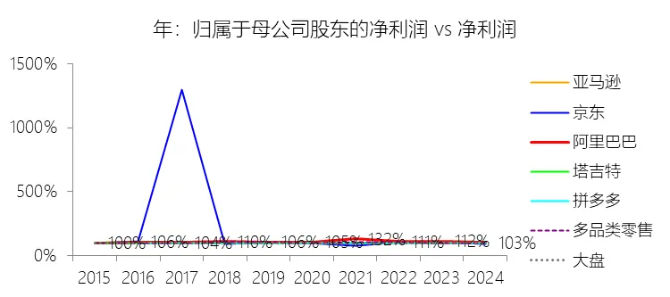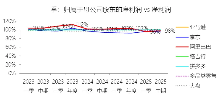 归属于母公司股东的净利润:2026财年中期,阿里巴巴的归属于母公司股东的净利润为86.79亿美元,同比减少11.12%,与净利润的比例为97.90%,同比下降3.37个百分点;2016-2025财年(十年),此项合计为1344.41亿美元,平均比例为107.67%,比多品类零售行业的均值高5.5个百分点,长期呈上升趋势。**比例短期下降主要由于**阿里巴巴在2026财年执行了积极的业务优化与资产减损战略,特别是在完成对高鑫零售(Sun Art)和银泰商业(Intime)等实体零售业务的剥离后,合并报表范围发生了结构性变化。同时,公司近期加大了对“AI驱动”战略及即时零售(如淘宝秒送)等新业务的投入,加之部分子公司如阿里健康、盒马及大文娱板块经营效率提升并实现减亏或盈利转正,使得原本由母公司承担的亏损补贴减少,少数股东权益开始由负转正分享利润,从而导致归属于母公司的利润占比从此前常态化超过100%的水平向100%下方回归。**比例长期上升主要由于**阿里巴巴在过去十年的生态扩张中,通过持续并购将大量处于投入期且持续亏损的业务(如饿了么、Lazada、数字媒体及早期菜鸟网络)纳入合并报表,这些业务在带来高营收的同时也产生了显著的少数股东亏损。根据会计准则,当子公司亏损时,母公司股东需在合并报表中抵减这些亏损,导致归属于母公司的净利润在数值上往往超过合并总净利润,这种“高基数、高投入”的扩张模式使得过去十年的平均比例高达107.67%并呈上升趋势。**比例高于多品类零售行业的均值主要由于**阿里巴巴构建的是一个独特的“核心盈利引擎驱动多元化亏损外环”的数字经济生态体系,其核心电商业务具备极高的利润边际,而传统零售行业则多由业务成熟、盈利稳定的实体门店组成。相比于行业均值,阿里巴巴拥有更多处于亏损培育期的战略性板块(如云计算、本地生活及海外扩张),这种结构性的少数股东亏损抵补效应在报表上表现为母公司利润占比长期大幅溢价于传统零售业均值。
