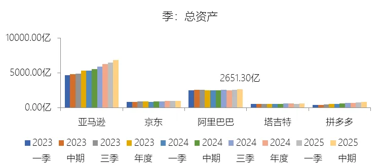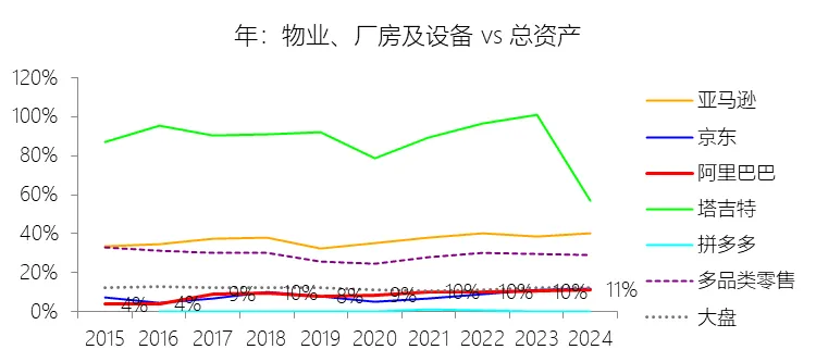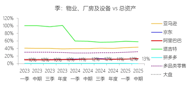物业、厂房及设备:2026财年中期末,阿里巴巴的物业、厂房及设备为346.97亿美元,对比年初增长22.48%,与总资产的比例为13.09%,同比上升1.29个百分点;2016-2025财年(十年),此项合计为1734.11亿美元,平均比例为9.36%,比多品类零售行业的均值低19.37个百分点,长期呈上升趋势。