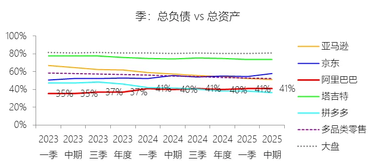 负债率:2026财年中期末,阿里巴巴的总负债为1086.62亿美元,对比年初增长9.22%,与总资产的比例为40.98%(负债率),同比上升1个百分点;2016-2025财年(十年),此项合计为6734.69亿美元,平均比例为36.36%,比多品类零售行业的均值低21.87个百分点,长期呈上升趋势。比例短期上升主要由于公司在2026财年中期积极推进“AI驱动”和云计算基础设施扩张战略,通过加大债务融资力度来支撑高额的资本开支,期内新增借款同比大幅增长68.72%,导致总负债9.22%的增速明显超过了同期总资产5.48%的增速;同时,公司近期完成了对多笔信贷便利的重组和可转换高级票据的发行,这些融资活动在优化资本结构、增加资金储备的同时,也推高了账面的短期及长期债务规模。比例长期上升主要由于阿里巴巴业务模式发生了深刻转型,由早期的轻资产平台撮合模式向重资产的“新零售”直营及物流模式(如天猫超市、盒马、菜鸟及整合后的高鑫零售)演进,这一过程伴随着应付账款、经营租赁负债及相关基础设施投入负债的大幅增加;此外,过去十年间公司执行了频繁的战略性扩张,将大量涉及高负债率的被投资公司(如饿了么、Lazada)纳入合并报表,加之随业务规模扩张而逐年累积的递延所得税负债,共同驱动了负债率长期呈上升趋势。比例低于多品类零售行业的均值主要由于阿里巴巴核心的电商平台业务(淘宝、天猫)建立在高度数字化的流量变现模型之上,其“轻资产”的商业本质使其在创造巨额交易额时,无需像传统零售业那样依赖沉重的银行贷款来维持物理门店扩张或大规模库存周转;公司长期以来维持着极度充裕的现金储备及投资性资产(截至2025财年末达1.8万亿人民币级别),这种“现金牛”体质赋予了公司极强的内源性融资能力,使其财务杠杆率长期保持在远低于传统多品类零售商的稳健水平。