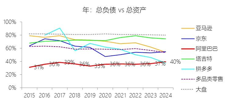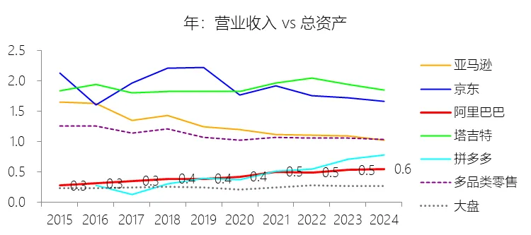 总资产增长率:2026财年中期末,阿里巴巴的总资产为2651.30亿美元,对比年初增长5.48%,增速同比(去年同期)上升4.35个百分点;2016-2025财年(九年)增长345.86%,年复合增长18.07%,比多品类零售行业的复合增速低0.4个百分点,长期呈下降趋势。增速短期上升主要由于公司在2026财年中期积极推进“AI驱动”战略,大幅增加了在云计算及人工智能基础设施方面的资本支出,导致物业、厂房及设备账面价值较年初显著增长22.48%;同时,中期内公司优化了资产配置,加大了对股权证券及债务工具的投资,且部分持有的上市公司股权随市场波动出现了价值回升,共同推升了总资产的短期增速。增速长期下降主要由于阿里巴巴近年来执行了严谨的资本管理计划,通过业务剥离战略完成了对高鑫零售(Sun Art)及银泰商业(Intime)等重资产业务的处置,导致合并报表资产规模发生结构性收缩;此外,公司大幅提升了股东回报力度,通过巨额股份回购及持续派发股息消耗了大量现金储备,加之过去数年间受宏观环境及被投资公司估值调整影响,对投资资产及商誉计提了多项减值准备,显著削弱了资产的长期增长基数。增速低于多品类零售行业的复合增速主要由于阿里巴巴的核心业务模式本质上是高度数字化的“轻资产”平台模式,其交易规模的扩张并不依赖于传统零售业所需的物理门店或大量库存资产的同步增长,具有极高的资产周转效率但也限制了资产账面的扩张速度;同时,相比于仍处于物理扩张期的传统零售同行,阿里巴巴正处于从规模扩张向质量提升转型的资产优化期,通过频繁的非核心资产剥离和资本回收来提升整体投资回报率,导致其资产复合增长水平略低于行业均值。