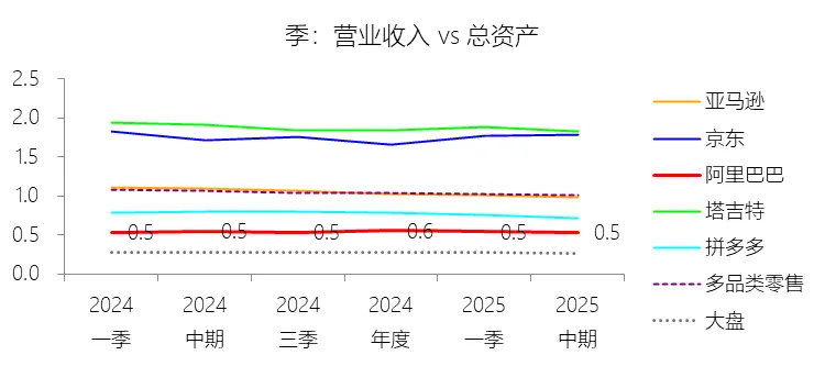 总资产周转率:2026财年Q2 TTM,阿里巴巴的总资产周转率为0.5次,同比下降0.02次;2016-2025财年(十年),平均总资产周转率为0.5次,比多品类零售行业的均值低0.63次,长期呈上升趋势。