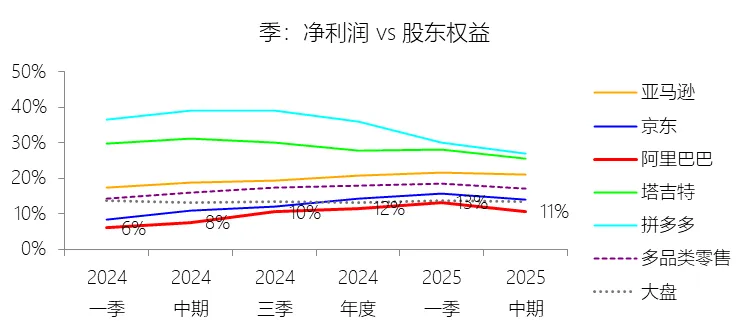 净资产收益率:2026财年中期末,阿里巴巴的股东权益为1564.68亿美元,对比年初增长3.03%,净利润与股东权益的比例为10.72%(TTM净资产收益率),同比上升3.18个百分点;2016-2025财年(十年),此项合计为11785.54亿美元,平均比例为10.59%,比多品类零售行业的均值低3.01个百分点,长期呈下降趋势。