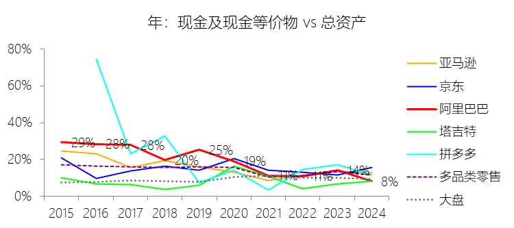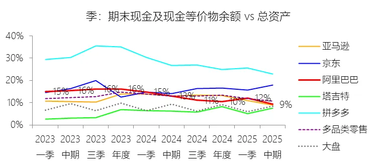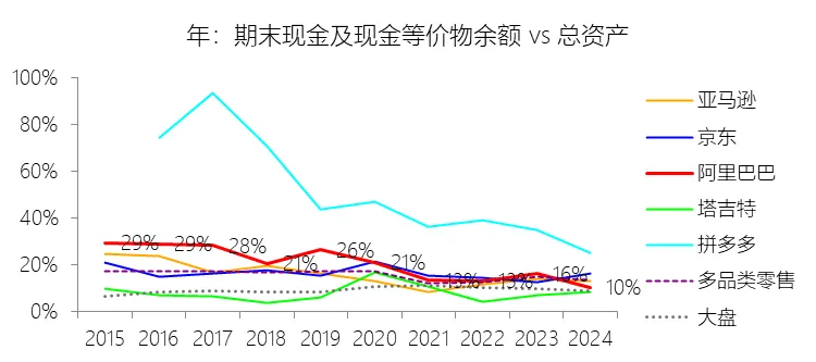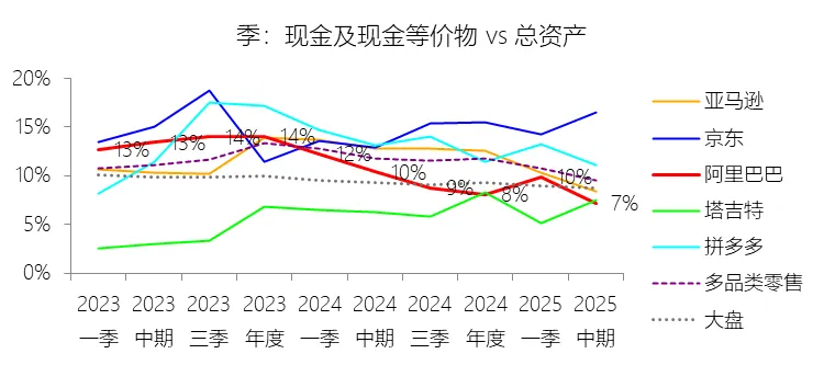 期末现金及现金等价物余额:2026财年中期末,阿里巴巴的期末现金及现金等价物余额为246.91亿美元,对比年初减少6.36%,与总资产的比例为9.31%,同比下降3.65个百分点;2016-2025财年(十年),此项合计为3384.97亿美元,平均比例为18.28%,比多品类零售行业的均值高3.4个百分点,长期呈下降趋势。