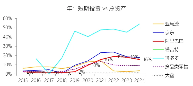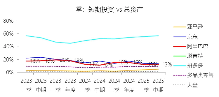 短期投资:2026财年中期末,阿里巴巴的短期投资为335.66亿美元,对比年初减少14.74%,与总资产的比例为12.66%,同比上升0.99个百分点;2016-2025财年(十年),此项合计为2102.67亿美元,平均比例为11.35%,比多品类零售行业的均值高2.91个百分点,长期呈上升趋势。