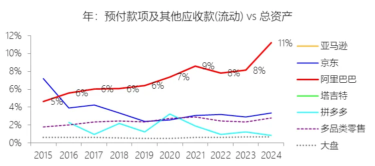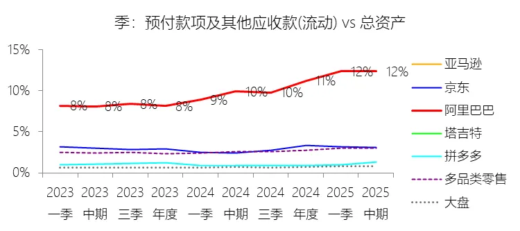 预付款项及其他应收款(流动):2026财年中期末,阿里巴巴的预付款项及其他应收款(流动)为327.45亿美元,对比年初增长16.26%,与总资产的比例为12.35%,同比上升2.43个百分点;2016-2025财年(十年),此项合计为1445.30亿美元,平均比例为7.80%,比多品类零售行业的均值高5.28个百分点,长期呈上升趋势。