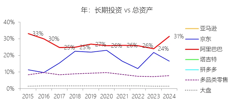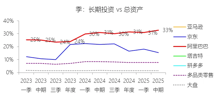 长期投资:2026财年中期末,阿里巴巴的长期投资为870.90亿美元,对比年初增长10.26%,与总资产的比例为32.85%,同比上升1.8个百分点;2016-2025财年(十年),此项合计为4954.92亿美元,平均比例为26.75%,比多品类零售行业的均值高18.43个百分点,长期呈下降趋势。