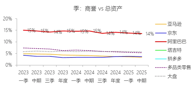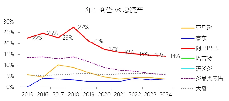 商誉:2026财年中期末,阿里巴巴的商誉为359.65亿美元,对比年初增长1.04%,与总资产的比例为13.57%,同比下降1.16个百分点;2016-2025财年(十年),此项合计为3332.39亿美元,平均比例为17.99%,比多品类零售行业的均值高9.25个百分点,长期呈下降趋势。**比例短期下降主要由于**公司在2026财年中期积极推进“AI驱动”战略,大幅增加了在云计算及人工智能基础设施方面的资本开支,导致物业、厂房及设备等账面资产增速(5.48%)显著快于同期商誉的增长速度(1.04%),从而在总资产中产生了结构性的稀释效应。同时,公司近期审慎的投资并购节奏使得新增商誉规模有限,进一步促使商誉占总资产的比例同比下降了1.16个百分点。**比例长期下降主要由于**阿里巴巴近年来执行了严谨的资本管理与业务优化策略,一方面针对**大文娱(如优酷)及部分实体零售业务(如高鑫零售)计提了多次巨额商誉减值准备**,以反映市场环境变化及业务模式调整带来的估值修正;另一方面,公司业务模式已从早期的轻资产平台模式转向包含**直营零售(如天猫超市、盒马)及物流基础设施(如菜鸟网络)**在内的混合模式,总资产基数随固定资产、存货等实物资产的增加而显著扩大,加之公司完成了对**高鑫零售及银泰商业等业务的剥离处置**,直接导致了相关合并商誉的核销,驱动占比长期下行。**比例高于多品类零售行业的均值主要由于**阿里巴巴构建的是高度数字化的数字经济生态体系,其过去十年的版图扩张深度依赖于对**移动媒体、本地生活、跨境电商等垂直赛道龙头企业的溢价并购**(如收购UCWeb、饿了么、Lazada及优酷等),这种外延式扩张模式产生的商誉溢价远超传统零售商通过物理门店扩张实现的内生增长;此外,互联网平台并购标的通常具有高增长潜力但净资产较低的特性,导致**收购对价中分配至商誉的部分极大**,这种数字经济特有的资产结构使其商誉占比长期维持在行业领先水平。