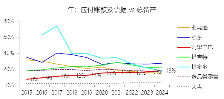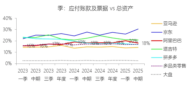 应付账款及票据:2026财年中期末,阿里巴巴的应付账款及票据为479.58亿美元,对比年初增长3.52%,与总资产的比例为18.09%,同比下降0.22个百分点;2016-2025财年(十年),此项合计为2751.98亿美元,平均比例为14.86%,比多品类零售行业的均值低3.69个百分点,长期呈上升趋势。