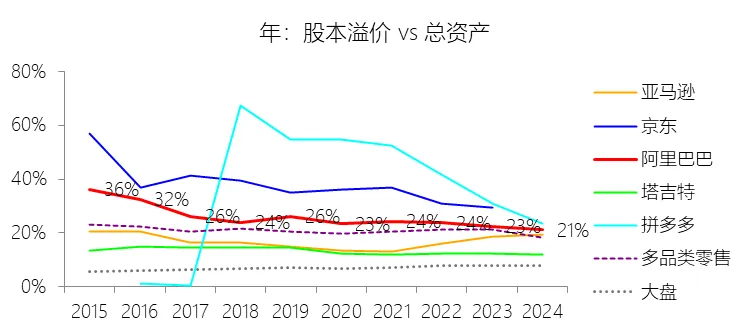 股本溢价:2026财年中期末,阿里巴巴的股本溢价为544.86亿美元,对比年初增长2.55%,与总资产的比例为20.55%,同比下降1.02个百分点;2016-2025财年(十年),此项合计为4515.13亿美元,平均比例为24.38%,比多品类零售行业的均值高3.87个百分点,长期呈下降趋势。**比例短期下降主要由于**公司在2026财年中期积极推进“AI驱动”战略,导致物业、厂房及设备以及长期投资等资产规模较年初实现了5.48%的较快增长,而同期股本溢价虽因员工股权激励计划的行权及归属保持了2.55%的增长,但增幅明显滞后于总资产的扩张速度,从而导致其在资产总额中的占比出现结构性稀释。**比例长期下降主要由于**阿里巴巴近年来资本管理战略发生重大转向,为了提升股东回报,公司执行了极具规模的股份回购并进行了相应的注销处理,这在会计上直接抵减了股本及溢价规模;同时,随公司由轻资产平台模式向包含盒马、阿里健康等直营业务及整合菜鸟网络等重资产模式转型,总资产(分母)的长期复合增长率显著高于股本溢价(分子)的自然增值速度。**比例高于多品类零售行业的均值主要由于**阿里巴巴作为全球领先的互联网平台,其在纽交所IPO及香港联交所二次上市时均获得了极高的市场估值与融资溢价,奠定了远超传统零售企业的股本溢价基数;此外,公司长期将股权激励(SBC)视为人才竞争力的核心,通过持续授予员工限制性股票(RSU)和期权并将其公允价值记入溢价,这种数字经济特有的高额股权激励文化在传统实体零售行业中并不普遍;且公司在生态扩张过程中频繁采用发行股份的方式进行战略并购(如收购UCWeb、优酷土豆等),产生的巨额新增对价溢价进一步拉高了该项指标。