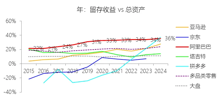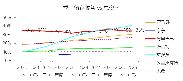 留存收益:2026财年中期末,阿里巴巴的留存收益为938.41亿美元,对比年初增长4.36%,与总资产的比例为35.39%,同比上升1.72个百分点;2016-2025财年(十年),此项合计为5855.62亿美元,平均比例为31.62%,比多品类零售行业的均值高10.75个百分点,长期呈上升趋势。