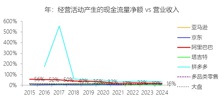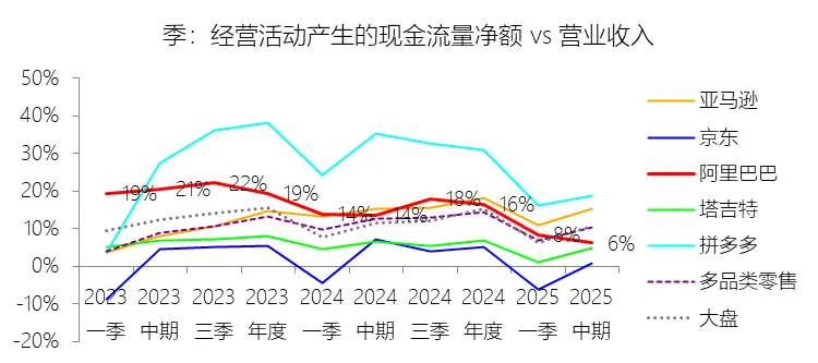 经营活动产生的现金流量净额:2026财年中期,阿里巴巴的经营活动产生的现金流量净额为43.31亿美元,同比减少53.37%,与营业收入的比例为6.21%,同比下降7.35个百分点;2016-2025财年(十年),此项合计为2240.68亿美元,平均比例为26.43%,比多品类零售行业的均值高13.91个百分点,长期呈下降趋势。**比例短期下降主要由于**公司在2026财年中期积极推进“AI驱动”战略,大幅增加了**云计算及人工智能基础设施的资本支出**,导致相关领域的投入对现金流产生了结构性挤压;同时,公司战略性加大了对**即时零售(Quick Commerce)业务**、用户体验及技术创新的投入,加之宏观经济环境导致消费需求趋于谨慎,从而引发的**营运资金变动**(如预收账款增长放缓)对经营活动现金流量净额产生了直接压力。**比例长期下降主要由于**阿里巴巴在过去十年间经历了向**“新零售”直营模式的重大转型**,包括整合高鑫零售、盒马及天猫超市等业务,此类直营模式虽然推高了总营收规模,但由于其涉及大量的库存占用、物流成本及相对较低的利润边际,显著稀释了合并报表中经营现金流占营业收入的比例;此外,随着中国互联网流量红利逐渐消退,公司为应对社交电商等新兴势力的激烈竞争,在**获客及用户留存、本地生活服务、以及Lazada等全球化扩张**板块进行了长期的战略性补贴与投入,且相关行政与研发支出的持续增长也对长期的现金流占比构成了压力。**比例高于多品类零售行业的均值主要由于**阿里巴巴的核心业务(淘宝和天猫)本质上是**高度数字化的数字平台模式**,具有显著的“轻资产”和高经营杠杆特性,无需像传统零售商那样承担沉重的物理门店租金、大量实物库存及相关的物理资产折旧开支;同时,其独特的货币化模型主要依赖于预收性质的**在线营销服务费和商家保证金**,这种“先收钱、后服务”的预收款模式结合强大的**网络效应和资产周转效率**,使其能够产生远超传统零售行业的营运现金流溢价,维持了极强的“现金牛”体质。