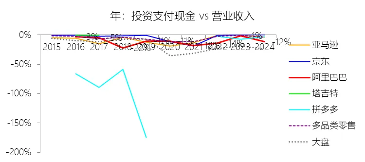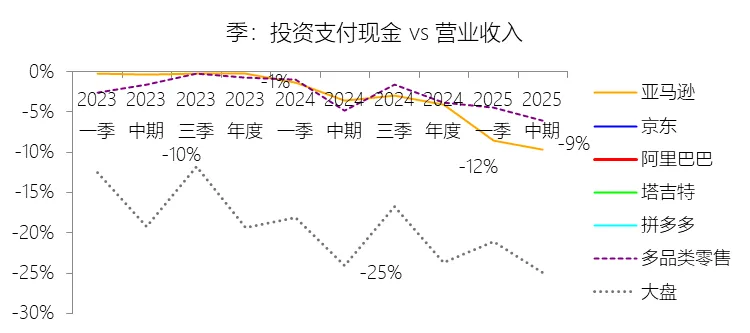 投资支付现金:2026财年中期,阿里巴巴的投资支付现金为-61.87亿美元,绝对值同比减少63.65%,与营业收入的比例为-8.87%,同比上升15.99个百分点;2016-2025财年(十年),此项合计为-950.22亿美元,平均比例为-11.21%,比多品类零售行业的均值低5.86个百分点,长期呈下降趋势。