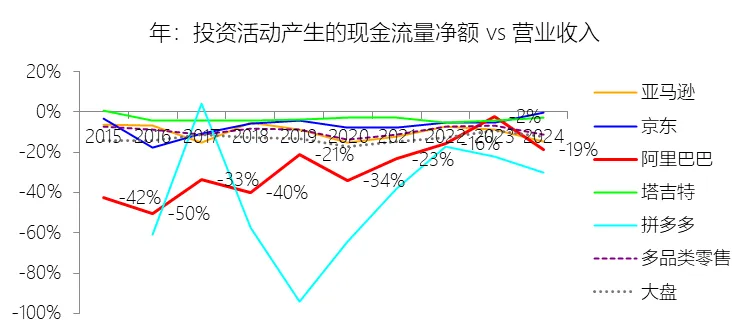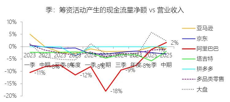投资活动产生的现金流量净额:2026财年中期,阿里巴巴的投资活动产生的现金流量净额为-72.23亿美元,绝对值同比增长45.18%,与营业收入的比例为-10.36%,同比下降3.09个百分点;2016-2025财年(十年),此项合计为-1862.41亿美元,平均比例为-21.97%,比多品类零售行业的均值低12.37个百分点,长期呈上升趋势。**比例短期下降主要由于**公司积极推进“AI驱动”战略,大幅增加了在云计算及人工智能基础设施方面的资本支出,导致2026财年中期购买固定资产支付的现金同比激增133.93%至98.76亿美元,其增速远超同期营业收入的增长速度;此外,公司在中期内加大了理财及国债等库务投资的净投放,虽然部分被处置非核心业务带来的现金回笼所抵消,但整体投资净流出的绝对值仍显著扩张,导致其占营收的比例出现结构性下行。**比例长期上升主要由于**阿里巴巴的投资策略发生了显著的战略转型,从过去十年早期频繁且巨额的生态版图扩张(如大规模收购优酷土豆、饿了么、Lazada等)逐渐转向成熟期的资本管理与资产优化;近年来,公司通过执行业务剥离战略,完成了对高鑫零售及银泰商业等非核心、重资产业务的处置,获得了可观的投资现金回笼,这种从“进取型扩张”向“资本回收与聚焦核心”的转变,使得投资净流出占营收的比例在长期内呈现缩减(即数值上升)趋势。**比例低于多品类零售行业的均值主要由于**阿里巴巴本质上是技术驱动的数字经济平台,其商业模式要求在云计算、大数据及人工智能等前沿技术基础设施上进行远超传统零售商的资本投入,以维持其技术领先地位;同时,公司构建了跨越电商、物流、本地生活及数字娱乐的深度融合生态体系,通过频繁的产业链上下游溢价并购实现生态闭环,这种高强度的战略投资属性与传统零售企业主要依靠物理门店扩张的资本支出结构存在本质区别,导致其投资活动现金流占比长期低于行业平均水平。
